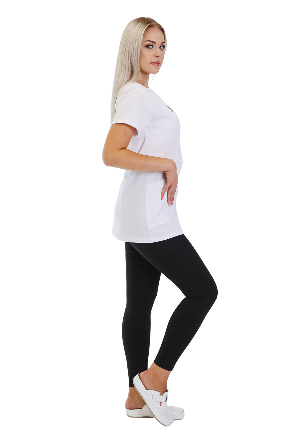 Letisztult, karcsúsított szabásvonalú húzózáras munkaköpeny, amely ideális választás egészségügyi, szociális, wellness vagy vendéglátóipari munkaterületeken. Egyedi, különleges “szívhullám” formájú nyakkialakítás kiemeli a dekoltázst, miközben elegáns és munkahelyhez illő marad.